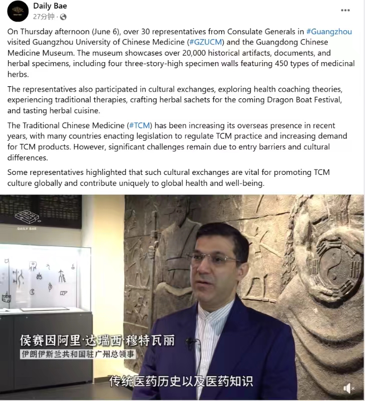 With the aim of promoting traditional Chinese culture, strengthening cultural exchanges between China and other countries, and getting to know more about traditional Chinese medicine, the Ministry of Foreign Affairs of Guangdong Province, in cooperation with the Guangzhou University of Chinese Medicine, organized an event titled Introduction to Traditional Chinese Medicine on June 7, 2024, with the presence of the Consulate General of Iran in Guangzhou at the Guangzhou University of Chinese Medicine.